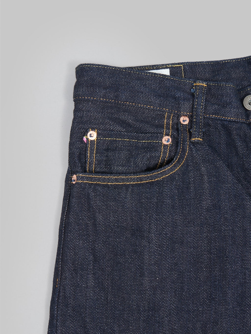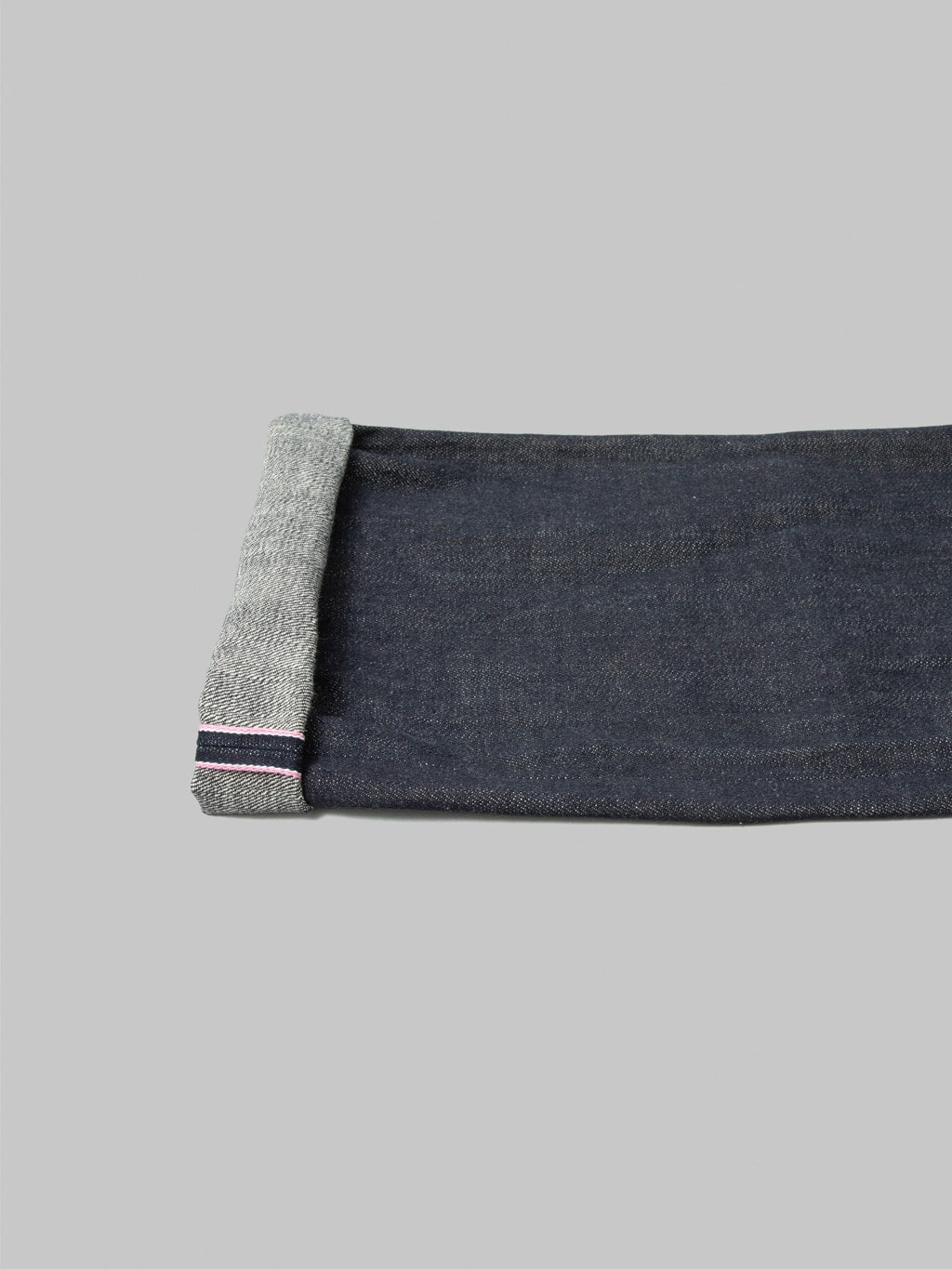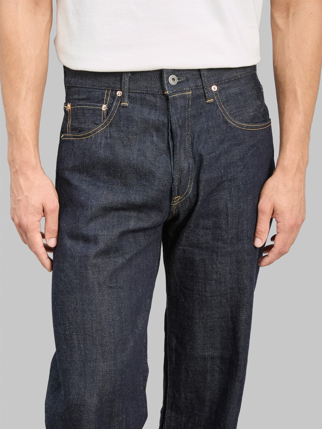 This ONI Denim jean represents a breakthrough with the brand's "Kiraku" series, featuring 12oz lightweight denim that challenges typical lightweight construction. Despite its reduced weight, this fabric maintains ONI's signature strong, rough texture and characteristic unevenness that defines their premium Japanese denim. Unlike typical lightweight denim made with fine-count yarns that often lacks substance, the Kiraku series achieves rich texture and depth through ONI's specialized weaving techniques. The result is a surprisingly light and comfortable wear without sacrificing the brand's distinctive fabric quality.